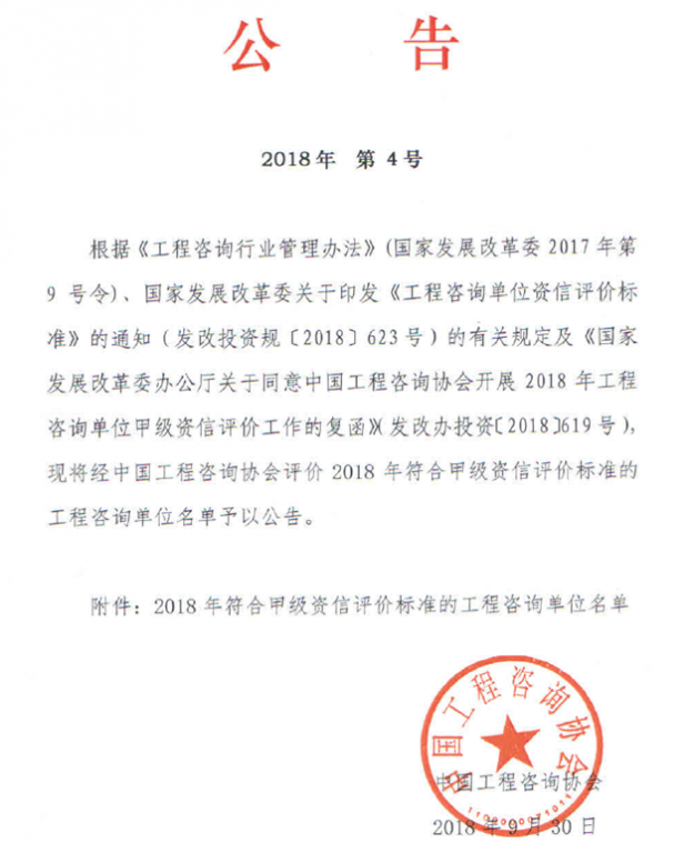 根据中国工程咨询协会开展的《2018年工程咨询单位甲级资信评价工作》要求,经过中华人民共和国住房和城乡建设部的评审,我院建筑、市政公用工程两个专业符合甲级资信评价标准,这意味着我院在工程咨询领域又迈向了一个新的台阶。
