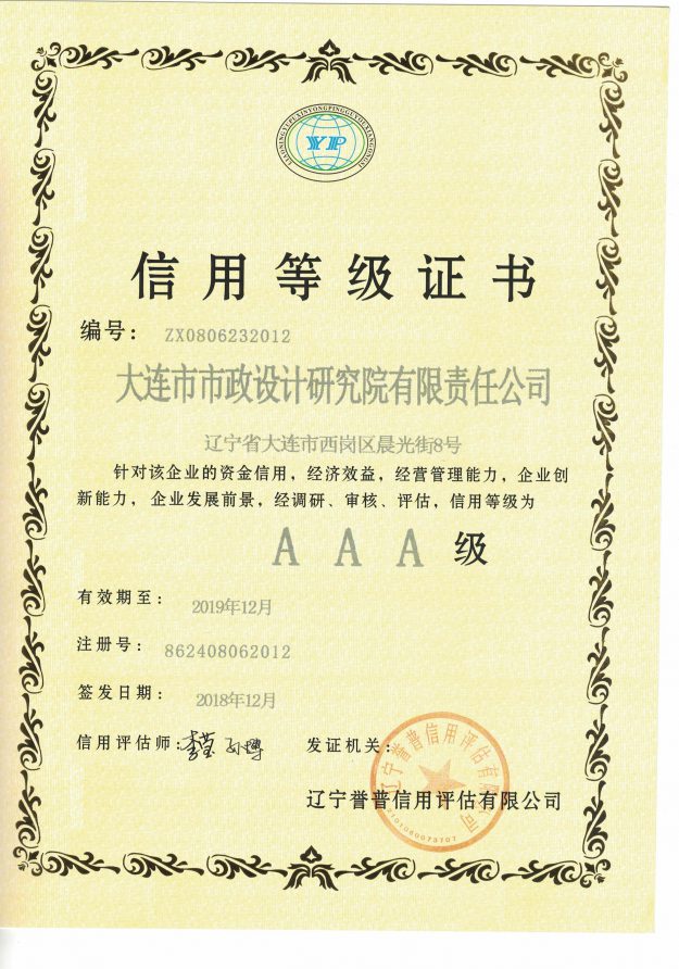 2018年12月2日,我院顺利通过由辽宁省信用中心审核的企业信用等级评价认证,获得AAA级企业信用评级证书。
